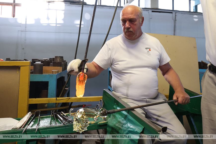 В другом цеху тоже вместе с командой работает отдельщик выдувных изделий экспериментально-художественного участка Валерий Багинский. Здесь изготавливают лошадей побольше и поизысканнее. Пластичная стекломасса постепенно приобретает понятные очертания, с каждым щипком она превращается во что-то оформленное. Постепенно вырисовывается туловище, голова, грива, ноги и хвост.